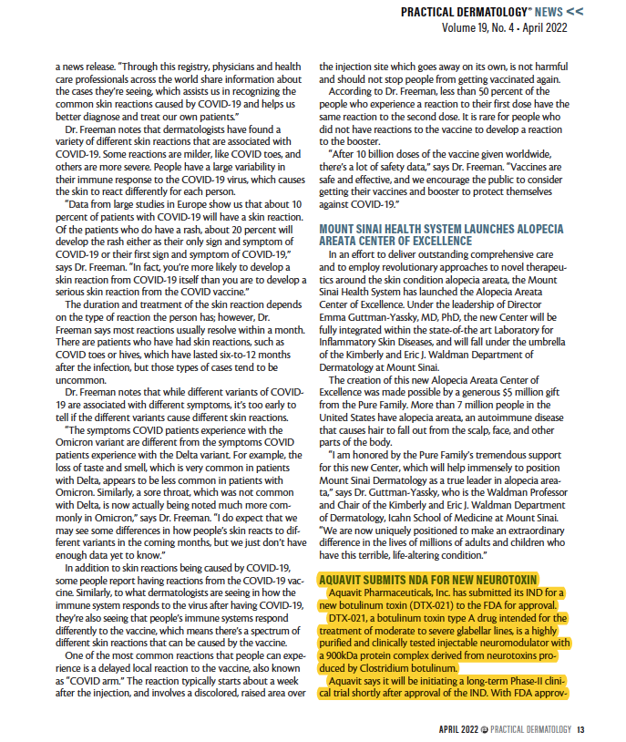 Aquavit Files IND Application for its Flagship Intradermal Injection of Botulinum ToxinNEW YORK, April 28, 2023 /PRNewswire/ -- Aquavit Holdings (Aquavit), a biotechnology company focused on the development of botulinum...
